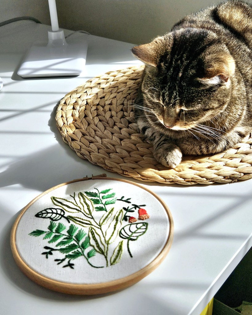The centre image was inspired by one of my dinner plates when I was trying a new way of transferring designs onto fabric ready to embroider. I’ve used the stitches I teach in my new beginner’s hand embroidery workshop. It explore using straight stitches, satin stitch and another six stitches.