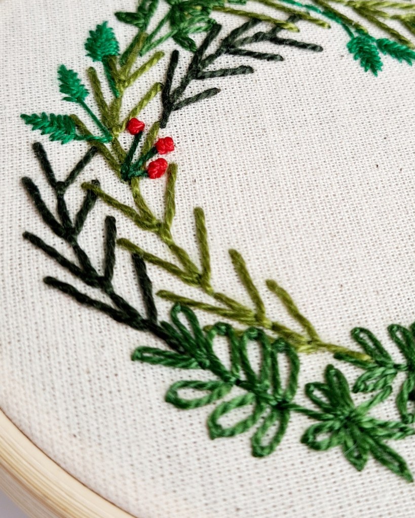 The image on the right is also a mixture of embroidery stitches, detached chain stitch is combined with back stitch to make leaves. Fly stitch has been used to create twigs and berries are tiny French knots. This design also brings in straight stitches, this is where I just just straight lines to build up a shape like a leaf.