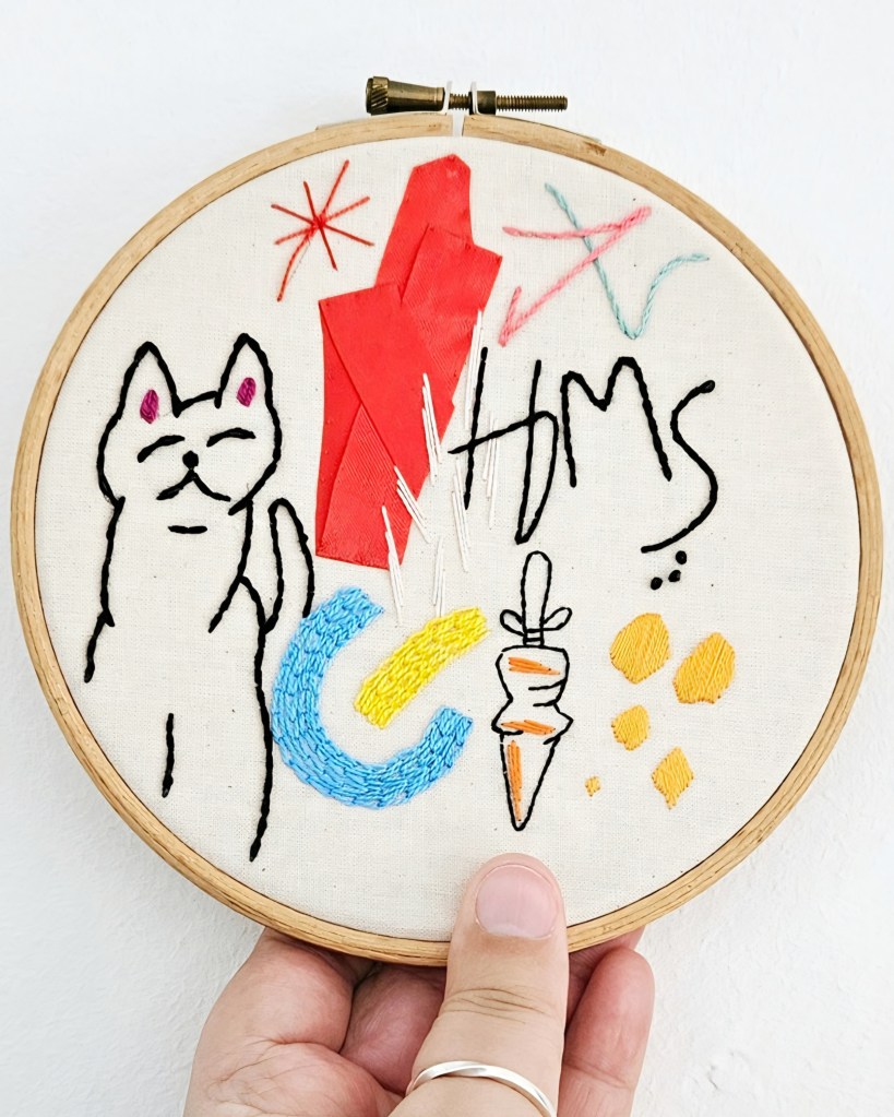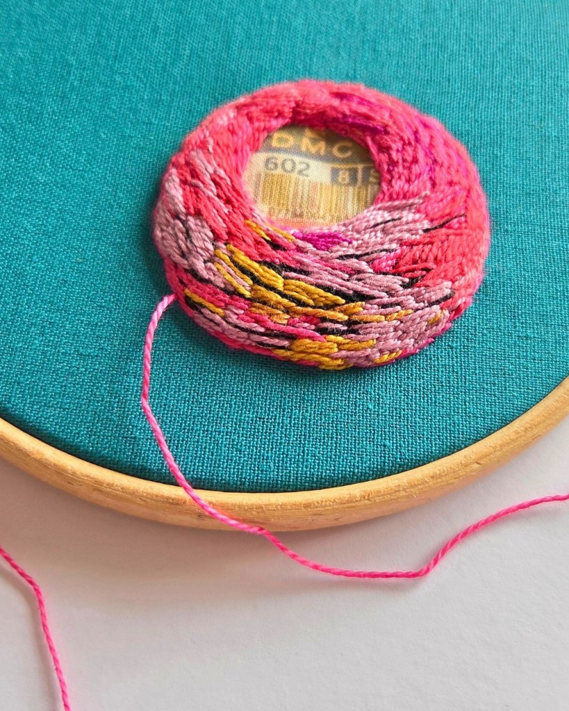 The centre image is a sample from a hand embroidered graffiti sample from a workshop in 2024. This combined a range of hand embroidery stitches to give different textures and styles. Each stitch is done in a Number 8 cotton perle thread. I used satin stitch, which I’m not great at as a filing stitch but I also chose to use chain stitch to fill two areas of the design.
