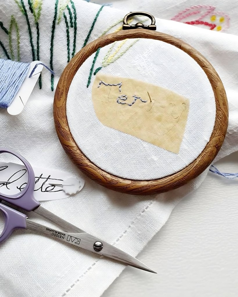 Going back to my earlier answer of back stitch as my favourite stitch, the piece on the left was a 2018 commission for the Seacroft Tapestry Project in 2018. Back stitch is my favourite stitch to use for handwriting. I can make the stitches small to trace the contours of delicate writing and it can be worked in six stranded embroidery thread or a finer thread.