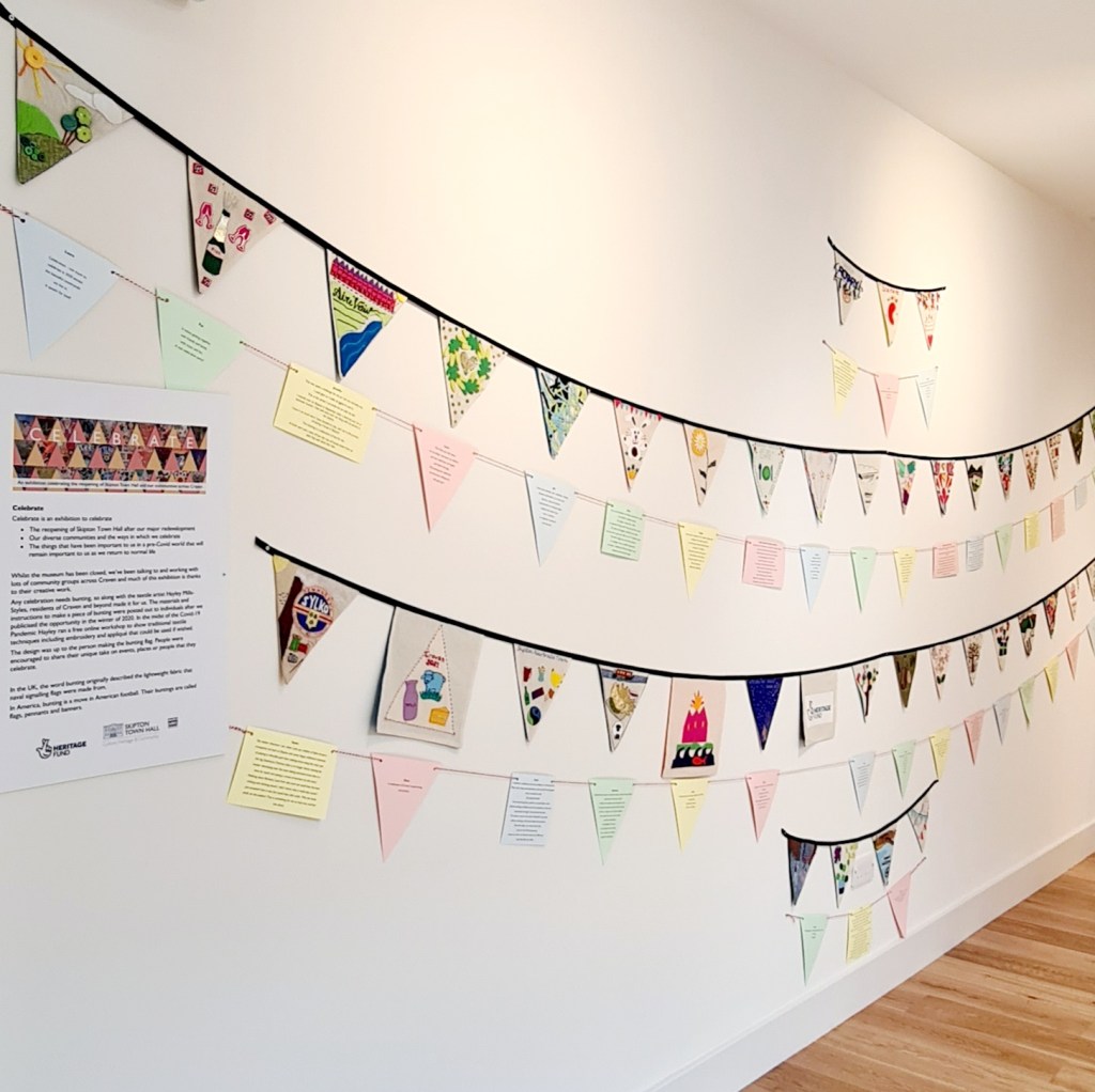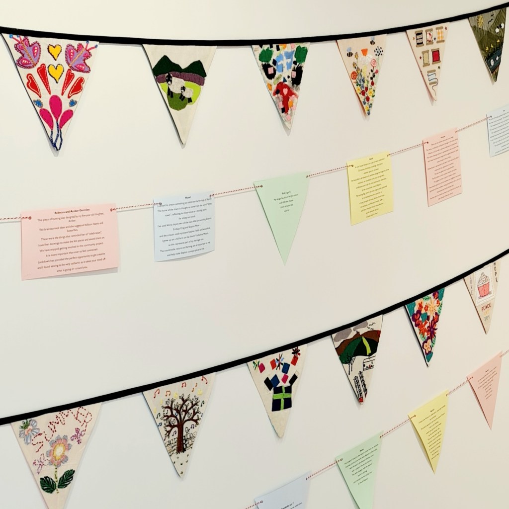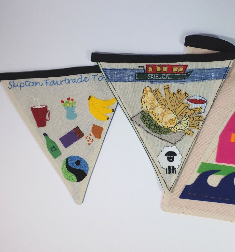 Participants from across Craven were invited to create a triangle for the bunting with the theme of celebration. The designs celebrated everything from local history and community groups to music and dance. People created their designs using hand embroidery, applique, paint and mixed media.