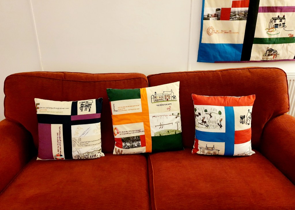 The embroideries came together to produce a series of soft furnishings for an installation at Chapel FM in Seacroft. The room was designed to look like a 1950s living room where the cushions, quilt and tablecloth were displayed.
