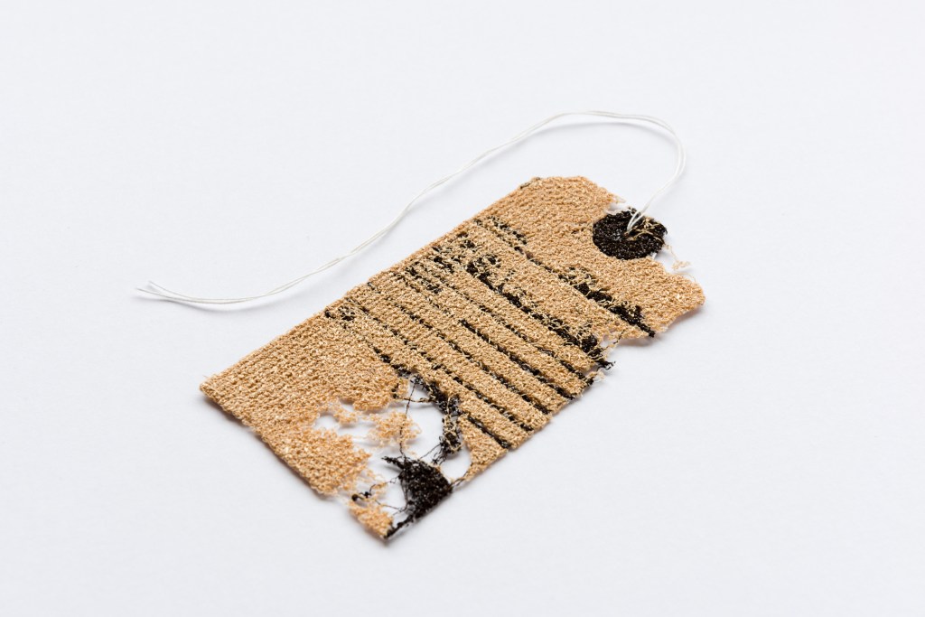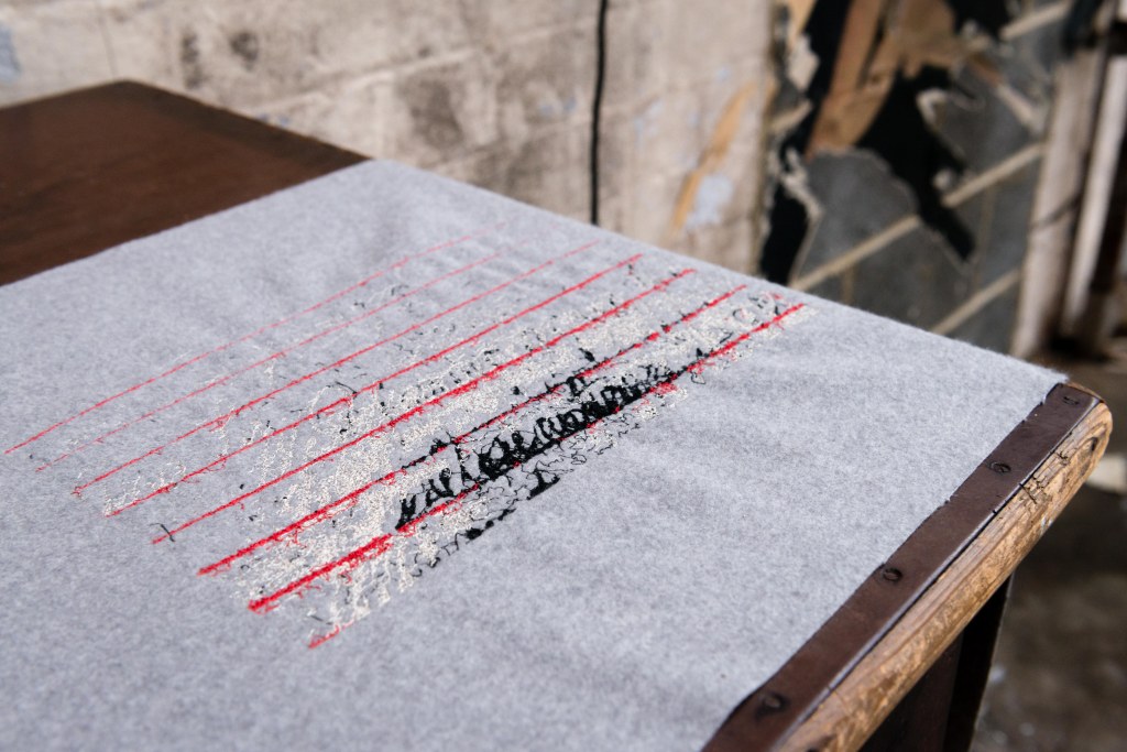 Each piece has been created using woollen fabrics and machine embroidery, creating a collection of stitched text fragments, each telling part of the story of the fabrics produced by Edwin Woodhouse & Co. and WC Gaunt. This collection of work was exhibited in the now demolished Finishing Room as part of the exhibition Weave//Fragments in 2017.