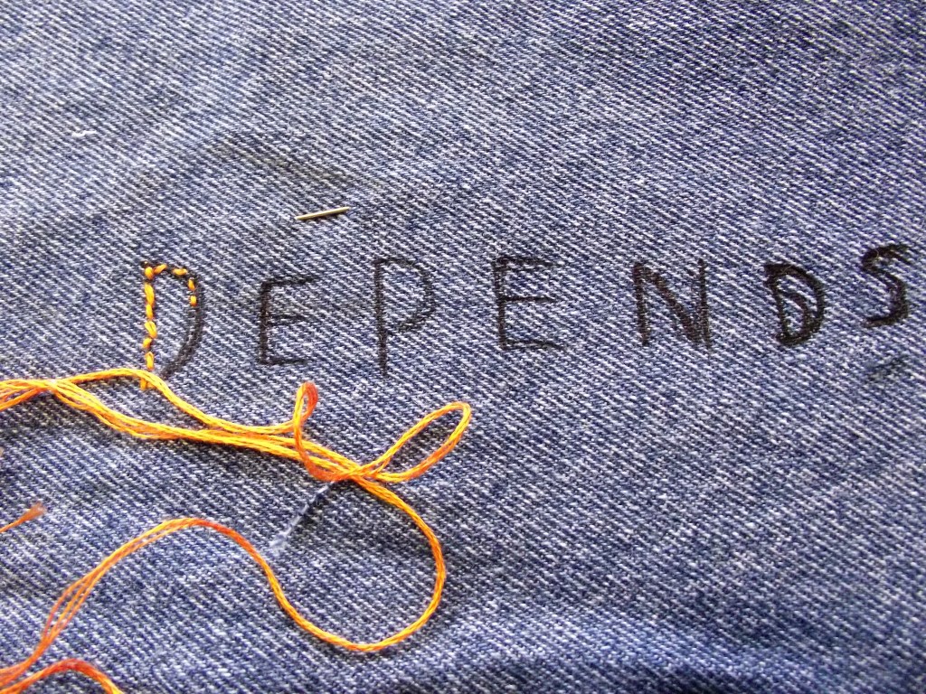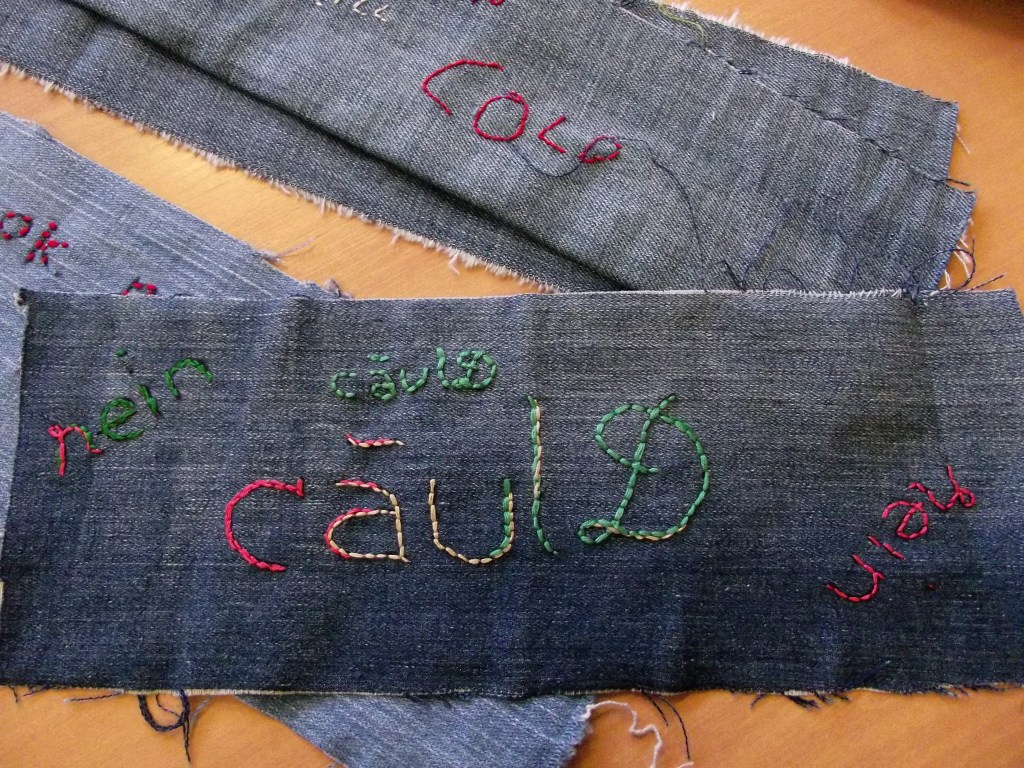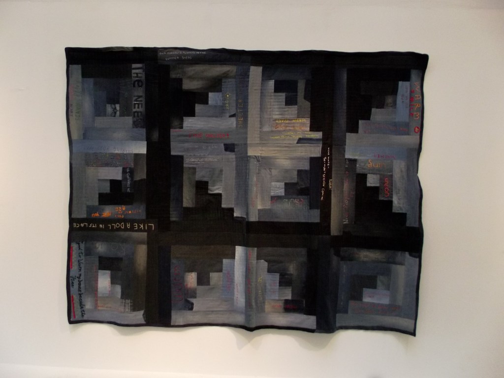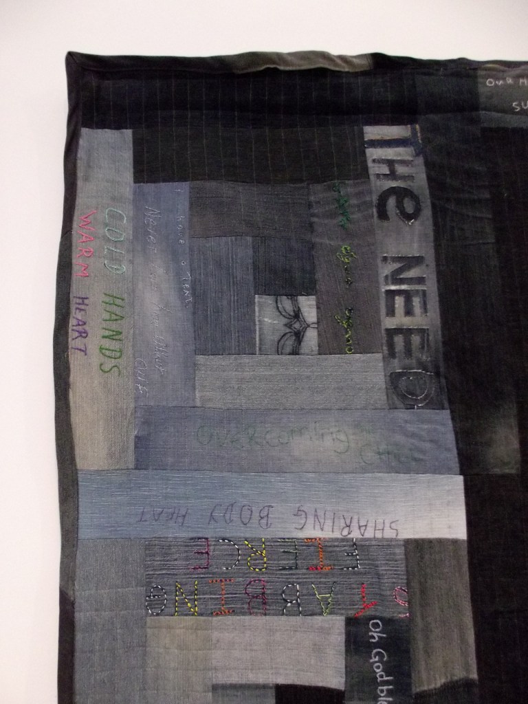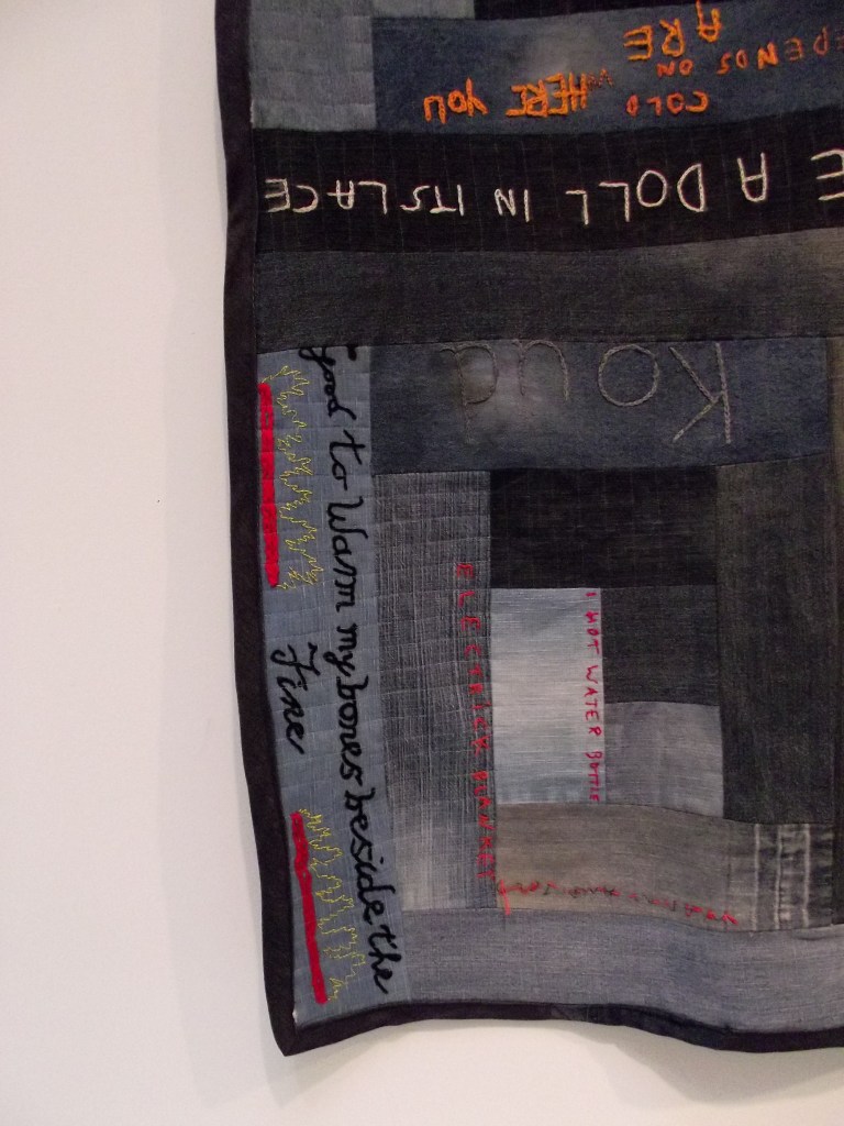 Using quotes from our sessions we began to work on a collection of denim patches, recycled from jeans Lois had collected. Brightly coloured thread traced hand written phrases which came together in form of a Log Cabin quilt.