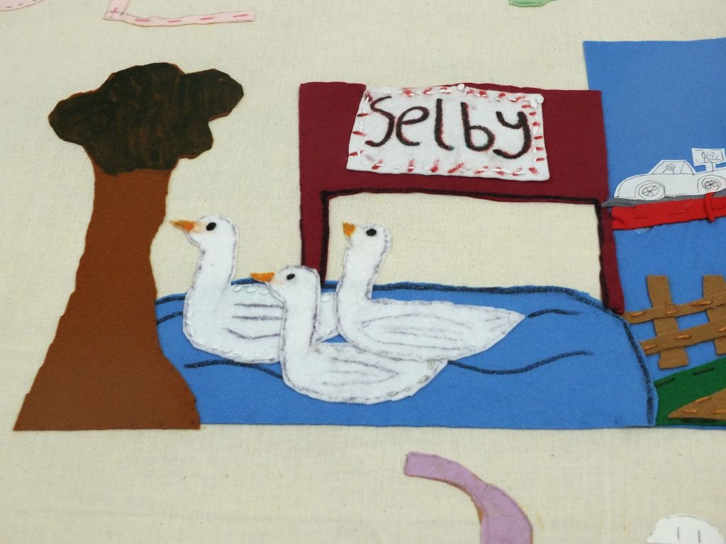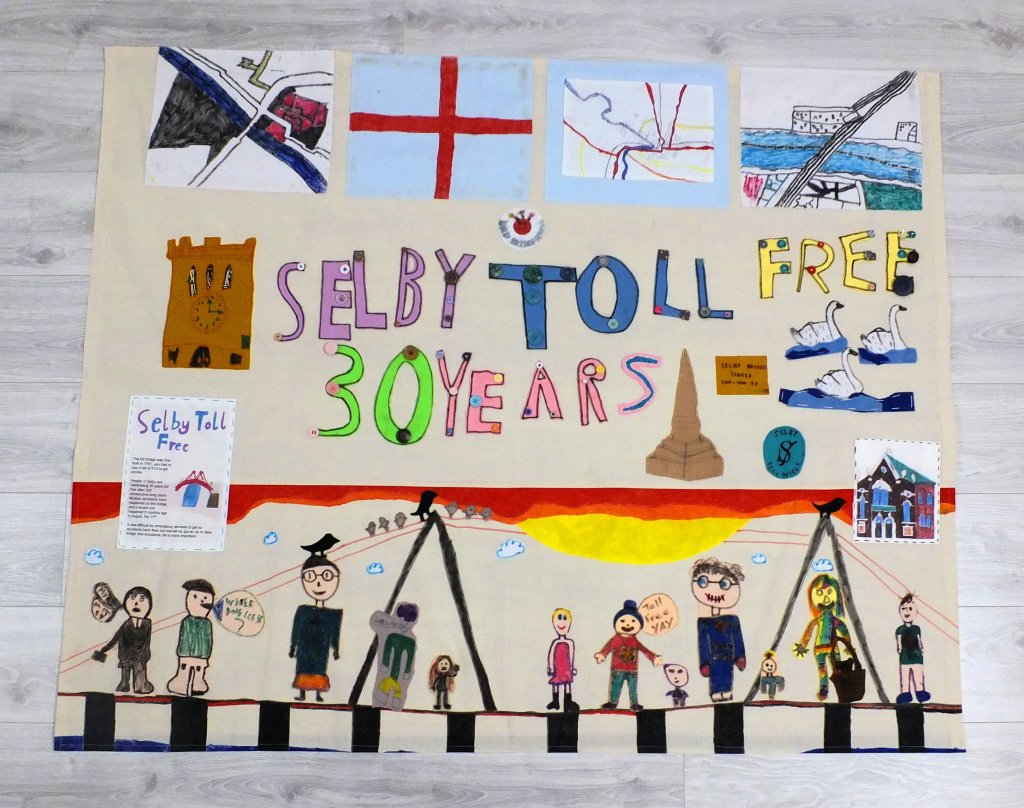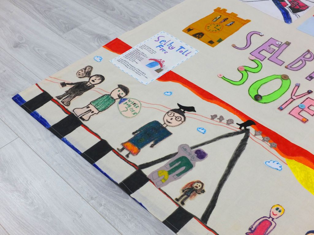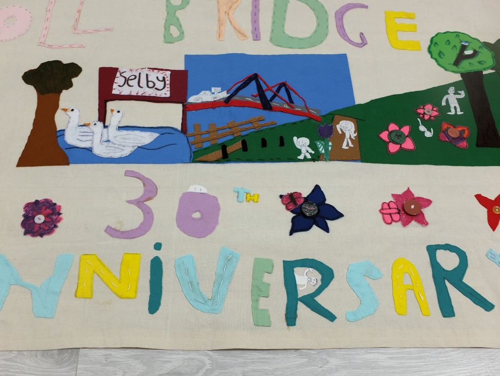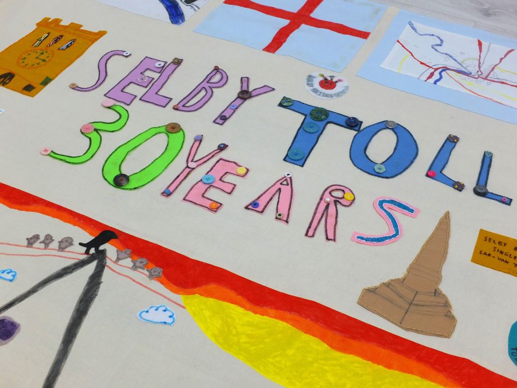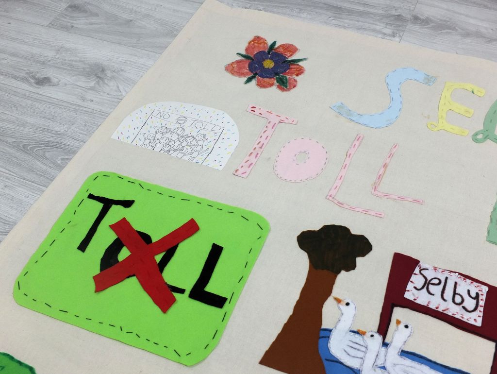 During the workshops, we researched local history and created banners celebrating 30 years since the toll bridge in Selby became toll free. Working with the primary school participants we used hand embroidery, drawing and writing to bring the banners to life and share the history of the town.